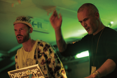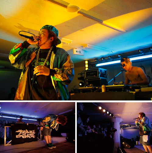 続いて〈KING ROOM〉に登場したのは地元・横浜代表のサ上とロ吉。この日は、風邪で喉を痛めたらしい上野がA.K.I.スタイルのデス声MCで気炎を上げ、「ジョン・レノンから譲り受けた」と言い張るサングラス着用の吉野が、イマジン・スタイル(?)でターンテーブルを操る。1MC&1DJのポテンシャルを最大限に引き出した定石のセットで盛り上げる一方、針飛びにぶち切れた吉野がラップをかますなどの新機軸も次々と披露。初恋の狂気を描いた“クレイジーラヴ”と、ロウな和もの使いが歪んだ空気を醸し出す“素敵な仲間”の新曲2曲も飛び出した。締めは“ヨコハマジョーカー”“Bay Dream~フロム課外授業~”の地元レペゼン・チューン2連発で、満員のフロアを鮮やかにロック・オン。いやはや、さすがのお手並み! *澤田