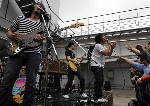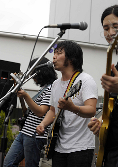 「『キラキラ!』発売記念ということでフリー・ライヴ。フリーですから、これはサービスですよ。今日はわれわれ4割くらいの力でやっております(笑)」と曽我部さん。そんなMCとは裏腹に、『キラキラ!』の冒頭を飾る“天使”と“結婚しよう”が、ありったけのテンションで奏でられます。