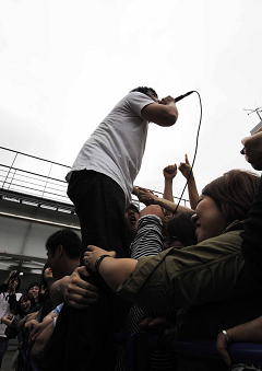 “青春狂騒曲”のコーラスが始まるやいなや、沸き上がる歓声。曽我部さんはマイクだけを握り締め、前列の柵に上って歌い、叫びます。もちろん会場は爆発的な盛り上がり!