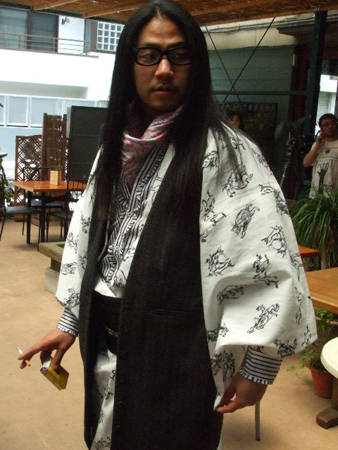 SOIL&“PIMP”SESSIONS(以下、SOIL)が登場して、ディレクター箭内さん、カメラマン平間さんと打合せ。京都友禅の着物を、洋服と組み合わせて思いっきり着崩したスタイルがカッコイイですね! 着物の柄は、楽器を演奏する動物たちが鳥獣戯画風に描かれたオリジナル和柄など。写真は秋田ゴールドマン(ベース)さんです。