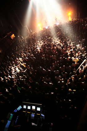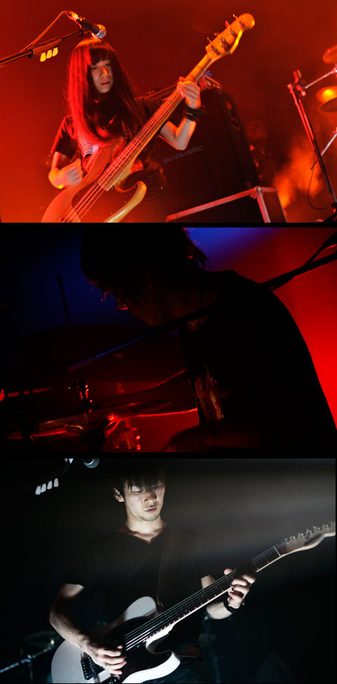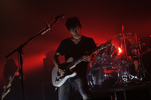 いわゆる〈突然変異型〉と言われる新世代バンドのなかでも、人気・実力共にトップ・クラスに位置する2組が激突した東名阪ツアーの最終日。先にステージ上へ姿を現したのは、凛として時雨だ。会場全体を震わせる怒号をものともせず、幻想的な声音で歌い始めた345のヴォーカルを、TKの絶叫がヒステリックに切り裂いてゆく。〈狂気と正気〉〈現実と非現実〉の対比が顕著な“赤い誘惑”からこの日のセットはスタートし、間髪入れずに彼ら屈指のアッパーなダンス・ロック・チューン“DISCO FLIGHT”へ移行。肌で感じる圧力をもって観客の肉体を刺激する345のベース、激烈アルペジオからメタリックな速弾きまで、驚異的なスピードで千変万化を遂げるTKのギター。フロアの興奮ぶりは、もはや頂点に到達しようとしている。