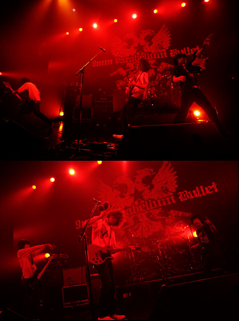 続いて登場したのは、今回のツアーのホスト、9mm Parabellum Bullet。初っ端からステージ上をところ狭しと暴れまわるフロント3人の傍若無人っぷりに、堪え切れず爆笑。メタル~ハードロック・マナーのプレイにギター・滝 善充のエア・ドロップキックやらベース・中村和彦のハードコア・ダンスやらが加わり、否が応でもステージへ目が釘付けになる(というか、ステージ上であまりにも多くの事象が同時に起こり過ぎて、彼らの動きを目で追うのに必死の状態)。さらには“Mr.Suicide”でヴォーカル・菅原卓郎も交えた3人のやたら息の合ったヘッド・バンギングも飛び出したとあっては、筆者の理性の壁は完全に崩壊。もちろん観客のテンションも急騰し、多くのダイヴァ-によってフロアはすでに大きく波打っている。