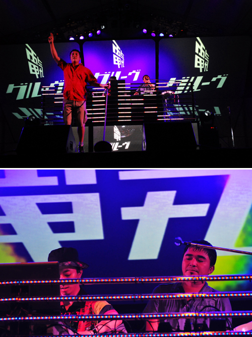 電気グルーヴ×オールナイトフジという夢の組み合わせが実現してしまったわけで、〈ORANGE COURT〉は当然のごとく超満員。のっけから入場規制がかかるなか、“ズーディザイア”のアーリー90'sな電子音が響き渡り、苗場レイヴは早くもピークへ突入する。この日の電気は、ステージ前方に瀧、後方のブースに卓球&KAGAMIという布陣。“モノノケダンス”での卓球のハイトーン・ヴォーカルに、“あすなろサンシャイン”での瀧のオペラ・ヴォーカルに、喜び全開の歓声があちこちから沸き上がる。“かっこいいジャンパー”では瀧がサイバーな電飾スーツに衣替え。クールなダンサー二人を従えると、なんと一糸乱れぬ完璧なロボット・ダンスを披露してみせたのであった……テクノ過ぎ! そして、続けざまに投入された“FLASHBACK DISCO”がテンションをさらに増幅させたところで、“虹”のメランコリックなメロディーが降り注ぐ。バレアリックなシーケンスに身を任せ、夜空を仰ぐオーディエンス。だが、オーラスに繰り出された“カフェ・ド・鬼”が、昇天しかけたフロアを一気に現実へと引き戻すのであった。ちなみに、ここでの瀧は、鬼束ちひろのグッズと思しき〈鬼Tシャツ〉を着て登場。背中に刻まれた、どデカい〈鬼〉の一文字をこれ見よがしに誇示していた。微妙なツボを付く最後の小技に、電気の真髄を感じた次第。*澤田