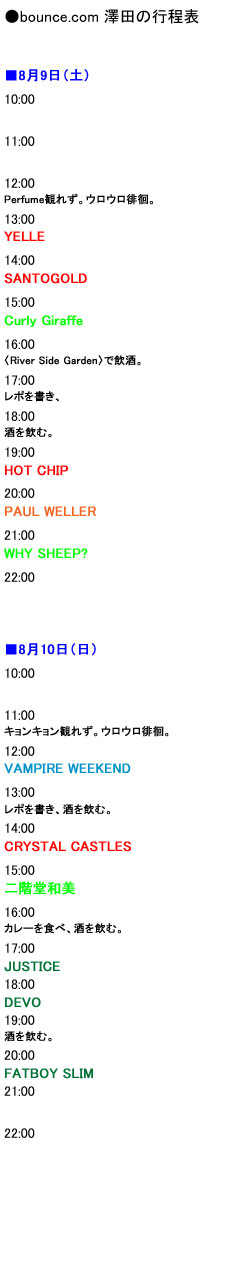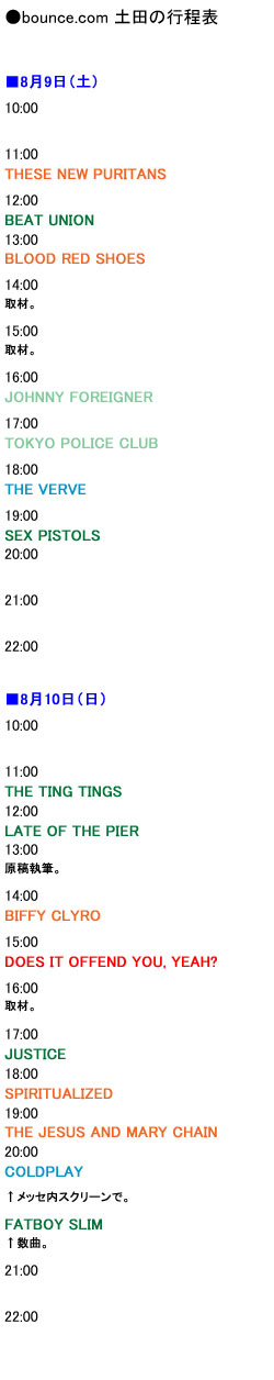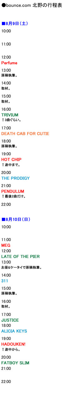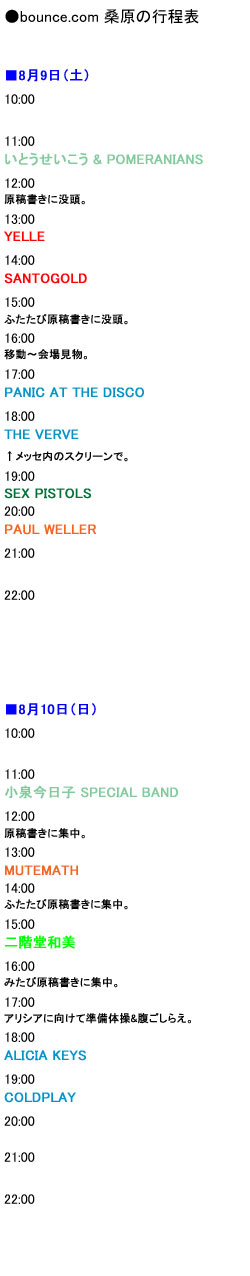 急遽メンバーが追加され、5名となった参加者の〈サマソニ〉行程表をご紹介。こちらを肴に、2ページ目以降の座談会をお楽しみください!