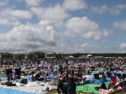 K10 で、僕が観た會田茂一ですが、彼はこの〈ライジング〉で3ステージに出演していて。ソロとEL-MALOとLOSALIOS、全部追いかけました。ソロでは〈BOHEMIAN GARDEN〉に出演したんですが、〈LOOK〉って書いてある七色のヘアバンドをして出てきて、客席がざわついてて。本人はボヘミアンっぽくしてみようと思ったらしいです(笑)。演奏は、打ち込みに乗せた弾き語りで演ってたんですが、声が甘くてジェントルでヤバかったですよ。女性ファンも多くて。虹色のヘアバンドをしてる男に向かって、「アイゴーン!」ってキャーキャー言ってました(笑)。その後は電気グルーヴを観たんですけど、最新作の『J-POP』からは“ズーディザイア”“モノノケダンス”だけで、あとはヒット・メドレー。“かっこいいジャンパー”とか“あすなろサンシャイン”とか、“NO”“虹”“Cafe de 鬼”。あとトピックとしては、〈まりん復活〉でしょうか。ハンドマイクで“ママケーキ”を歌ったりしてましたね。