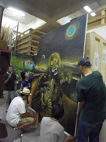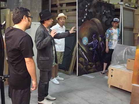 横尾さんと一緒に、絵の配置、ひとの立ち位置、照明など細部を打合せ中。「撮られる側があんまり言っちゃだめだよね」という横尾さんに「いやいや、うれしいです!」と喜ぶ箭内さん。いつのまにか横尾さんがディレクション(笑)!? 横尾さんのイメージどおりに、絵を移動するスタッフ。絵を触るときや絵の近くを通るときは緊張感が……!