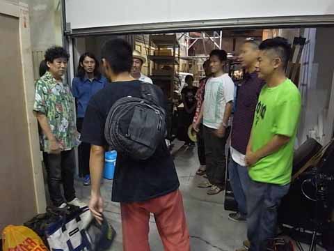 犬式メンバーが登場。ちなみに最近、IZPON(パーカッション)、犬島さん(ダブ・ミックス)というメンバー2名が増えたばかり。元々は世田谷美術館で〈横尾忠則 冒険王展〉を観て共演を熱望した横尾さんと緊張の顔合わせ! 犬式のCDを聴いた横尾さんに「歌が上手いね! 声がいいね!」と褒められたヴォーカル&ギターの三宅さん。恐縮しながらライヴへお誘いしてみたり……。