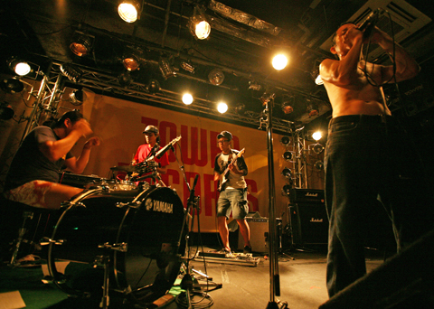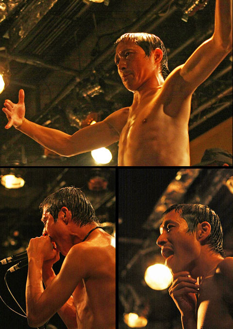 重厚なビートをストイックに鳴らし続けるプレイヤー陣の前で、ステージ上の〈アクション〉面を一手に引き受けるのはヴォーカルのビンゴ。上半身をジェルでコーティングしたルックスしかり、シュールとしか言いようのないポージングしかり、その予測不能なパフォーマンスは観客の目を惹き付けてやまない。“idiot”のブレイク部分での射撃、“ceiling”でのバレリーナをはじめ、この日はフェンシング、砲丸投げなどを採り入れた動きを次々と披露していたが、どうやらテーマは北京五輪と熊川哲也だったらしい。