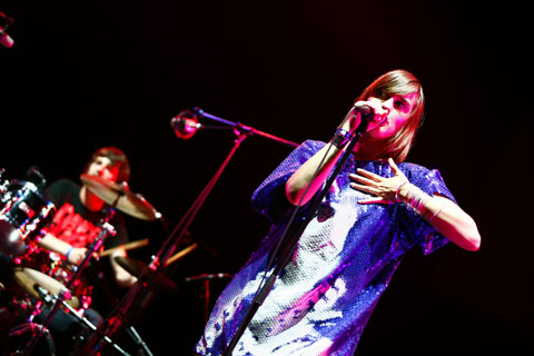 想像を絶する混みっぷり&入場規制でPerfumeは観れなかった……が、俺たちにはイエールがいるぜ! というわけで、ある意味フランスのPerfume(?)なエレクトロニック・ミューズを観るべく再度〈DANCE STAGE〉へ。パープルのスパンコール・シャツに真っ赤なタイツ姿のイエール嬢は、冒頭の“Tristesse/Joie”から、ステージ上をところ狭しとピョンピョン飛び跳ねる。打ち込み中心のサウンドながら、バックにはドラマーもいるのが日本の歌番組を見ているようで(?)面白い。前半は80'sでコケティッシュなエレクトロ・ポップで持ち前のキュートネスを振りまき、中盤からはオールドスクール・エレクトロ~バイレ・ファンキのブーミーなビートで下世話に迫る。途中で振り付けのコール&レスポンスをする辺りもPerfumeっぽいような(しつこい)。なによりも、エレクトロニックなサウンドとフランス語の語感との組み合わせが気持ちいい。フレンチでエレ・ポップな歌姫の元祖、リオの名曲“A Cause Des Garcons”のカヴァーをラスト近くで披露し、最高潮の盛り上がりを巻き起こすと、「メルシー・ボークー、アイ・ラヴ・ジャパン!」と投げキッスを決めてステージを後にした彼女。終演後は男子も女子も「かわいい~」を連発してました。*澤田