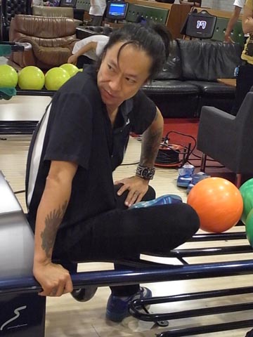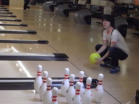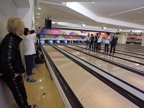 そのボールがなんと見事にストライク! 無欲の高スコアに、盛り上がってどよめく面々(笑)!