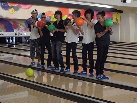 次のカットは、ボウリングのレーンへ移動。ボールが転がっている感じを撮影するために、スタッフが両手でボールを転がすことに……。