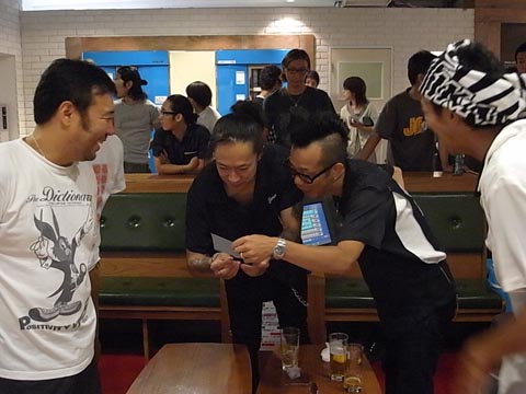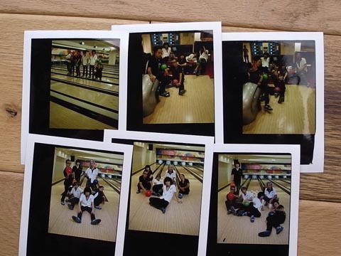 皆さんでポラチェック中。平間さんも加わって和やかに……。