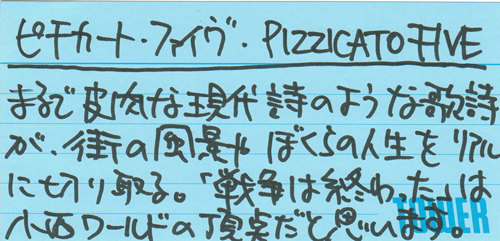 「あと椎名林檎の歌詞もすごい好きなんだよね。この間の〈エゾロック〉でライヴを見たけど、一生付いて行きます!って感じだった(笑)」と曽我部さん。そんな林檎さん談義に花を咲かせつつ……POPが完成です!