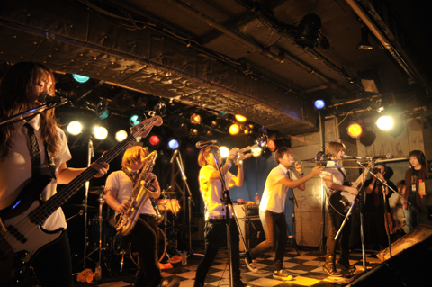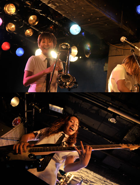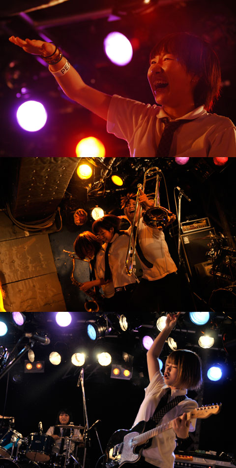 ホーンを縦に横にとブンブン振り回してフロアを煽りまくる彼女たちは、キラキラと輝く笑顔が超愛くるしくて、オーディエンスもおもわずニンマリしながら踊り騒ぎ! 3曲目の“ピノキオ”では早くもモッシュが飛び交うほどの大興奮だ。