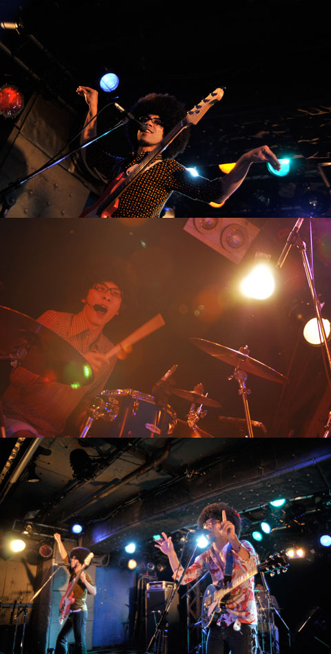 フロアにチラホラと咲く、黒やピンクのアフロ(の被り物)をボンヤリ眺めていると、ジャクソン5“I Want You Back”のSEに導かれてキモシャツ姿のアフロ3人組がファンキーに登場!