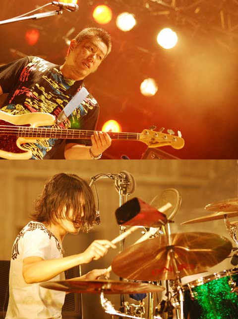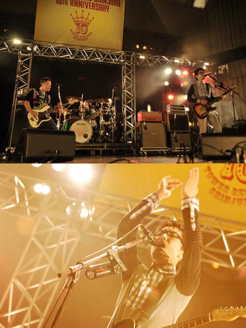で、一旦ブレーキをかけてMCに入ると、ここで恒例のノンストップ・パレード〈無限大ダンスタイム〉をスタート! ディスコティックに燃え上がる“Hi-Fi”や、激アッパーなエレクトロ・チューン“I'll be there”などの必殺曲を休みなく叩き込み、日の暮れかけた野音に眩いばかりのダンス・ステージを光臨させる。続く新曲“majestic trancer”では、VERBALのラップ部分をスター得意のライトハンド奏法を駆使したギター・ソロで滑り抜け、ライヴの定番“Transient Happiness”ではお馴染みの両足を左右にパカパカ開くダンス(?)も炸裂!