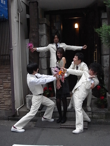 次は身体を使ってプロポーズ! SAKEROCKの面々が思いっきり愛を表現して、松下さんもびっくり(笑)! 手前左の伊藤さん(ドラム)も全身で花を差し出します……!