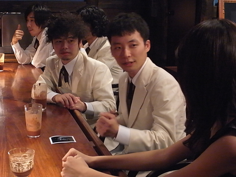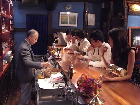 次は、店内のカウンターで撮影。バーテンダー尾崎さんがSAKEROCK&松下さんのために特別にカクテルを作ってくれることに……。チョコレートのカクテルは美味しいとみんな絶賛! それにしても、松下さんはバーで飲む姿が絵になってました。隣の星野さん(ギター)も俳優としての顔も持つだけに、ちょっとドラマのシーン(?)のようでした……。
