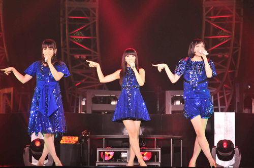 3度目のMCで、あ~ちゃんは「こんな大きな会場でやらせてもらえるなんて、ホント幸せなことだと思います」と感涙モードに。そして、のっちが「ライヴは終わりが近づいてるんですけど、まだ踊り足りてないですよね?」と煽ったところで“Dream Fighter”に突入し、ライヴもいよいよ佳境へ。“パーフェクトスター・パーフェクトスタイル”のサビでは会場中の腕が掲げられ、“ジェニーはご機嫌ななめ”では、「のっち!」「あ~ちゃん!」「ゆかちゃん!」とコールが轟く。とどめの“チョコレイト・ディスコ”で、会場は崩壊寸前のカオティックな状況に。そして、ギター・ポップ的な軽快なサウンドを聴かせる“Puppy love”で本編は大団円を迎えた。