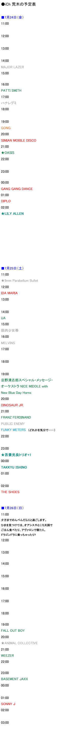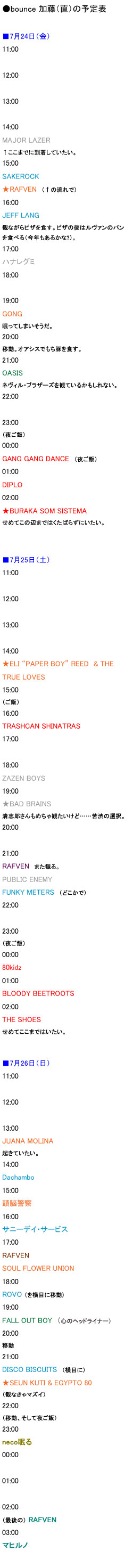 というわけで、以下が参加者4名のフジロック予定表。★マークがついているアーティストは、各々が〈マストで観る!〉とピックアップした面々です。