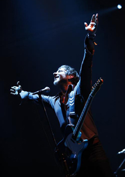 最新作『Snowflake Midnight』と同様、プログラミングとシンセを大幅に採り入れたアレンジで深遠なサイケデリック世界をよりシンフォニックに増幅してみせたこの日のマーキュリー・レヴ。スクリーンに投影されるスピリチュアルな映像と相まって、渦巻く轟音のなかに小宇宙を垣間見せるそのステージは〈最高!〉と叫ばずにはいられないものだったが、さらにロックオンされっぱなしだったのが、ヴォーカルのジョナサン・ドナヒュー(以下:J)によるとんでもなくシアトリカルなパフォーマンス。“Snowflake In A Hot World”では〈ドドドド・ドドドドドン!〉というドラムに合わせてエア鼓笛隊をキメるJ、“The Funny Bird”ではヨガのポーズをとる女性のシルエットから銀河系へと変化を遂げる映像を背景に、両手を上下させて鷹揚に羽ばたいてみせる(?)J、各所で見せ場を迎えたプレイヤー陣に歩み寄り、両手を振りかざしてはやたら力強く指揮する(もしくは気を送る?)J……。そんな数々のJの姿に最初は面食らったが、サウンドがとにかく劇的なため、劇的なアクションも仕方な……いや、感動を倍増させるから不思議だ。特に、ニコ“Evening Of Light”の荘厳なカヴァーから“The Dark Is Rising”“Senses On Fire”で迎えるフィナーレまでの昂揚感には鳥肌が立ちっぱなしで、Jが天に向かって両手を聖杯のように形作ってみせれば観客も両手を掲げ、Jが拳を突き上げればやはりフロアからも多くの拳が上がり、Jを中心に神秘的な一体感が生まれていた。今度は、もっと長いセットリストで観てみたい! *土田