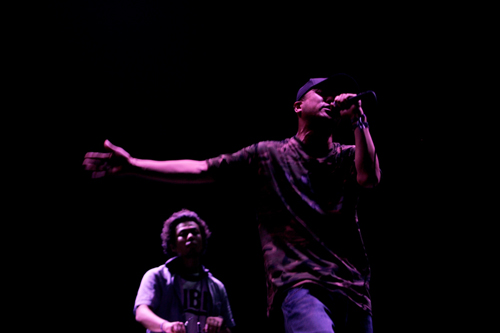 ゆっくりと、静かな歩調でステージ中央に進んだILL-BOSSTINOは、まるで儀式のような所作でペットボトルを後方に置くと、フロアに向かって「よくここまで残ったね。君たちの、その忍耐力と精神力にリスペクトを捧げます」と一言。BOSS的としか言いようのないその語り口が、この場に集ったひとりひとりの心をいきなり掴み、沸き立たせる。そして彼が腕を大きく振りかぶり、振り下ろすと同時に“Phase3”が鳴り渡った。DJ DYEの操るファット極まりないビートがみぞおちを深く揺さぶり、BOSSの発する一言一句がクサビのように頭に刻まれる。ステージを彩る装飾の類は一切なし。1MC&1DJだけの50分一本勝負は、過剰にストイックでありながら、過剰にドラマティックな物語を紡ぎ上げていく。切磋琢磨の日々を綴った“AMENIMOMAKEZ”、EGO-WRAPPIN'からZZ PRODUCTION(!)まで、同時代に生きるアーティストへの敬意を表明する“Rasing bull”……後半に進むにつれてビートからも解き放たれ、溢れんばかりのロマンティシズムに会場をどっぷり沈めた彼らがラストに繰り出したのは、なんと〈FUJI ROCK '00〉にて伝説化した名曲“Ill-beatnik”! 壮大なピアノの旋律とシンクロしながら、遠く冥王星に向けて言葉を投げかけるBOSSを、オーディエンスはもはや微動だにせず見守る。すべてを出し切ったBOSSが最後に「ありがとうございました」と力強く告げた瞬間、静寂に包まれていた会場からは割れんばかりの拍手と歓声が沸き起こった。*澤田