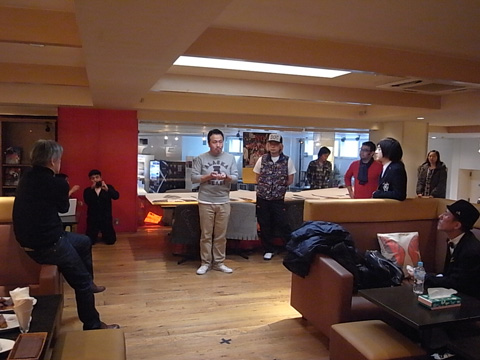 皆さんが集合したところで、撮影の段取りをタワレコ班長、いや番長が説明しています! 今年のポスターはタワレコ30周年を記念し、アーティストが〈メッセージ〉を伝えるもの。気になる〈メッセージ〉は、インタヴューとしてアーティストご本人の〈素〉の言葉を貰っています!
