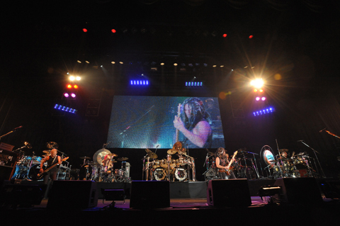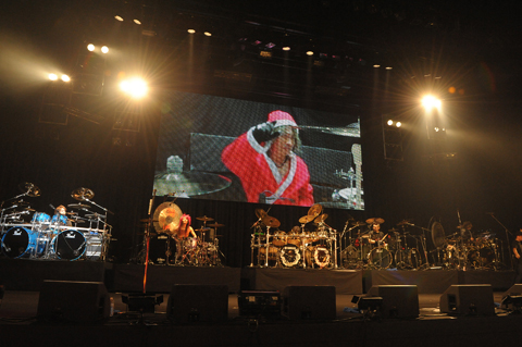 いやあ、とんでもないものを観てしまった……という感慨に浸るなか、今度は高崎のギター・ソロを交えてドラム・セッションへと繋がる。高崎のリフと共に真矢がドラム・ソロを披露して……と思ったら、ドラム・ライザーが移動し、同じようにshuji(Janne Da Arc)、鈴木、HIMAWARI(DUSTAR-3)、菅沼孝三というドラマーが次々に登場し、気が付くと舞台には5台のドラム・セットが並ぶというありえない光景に。その後、スクリーンに映った樋口のドラム・ソロとステージ上のドラマーが交互にドラム・バトルを繰り広げていく。かつてLOUDNESSのステージで行われた、樋口がスクリーンのなかの自分とドラム・バトルをするというセッションへのオマージュだ。途中、ミニ・ドラム・セットでの高崎による飛び入りもあり、ステージ上の全員がドラマー・樋口宗孝をリスペクトするようなドラム・ソロを披露する、あまりに濃厚なコーナーとなった。