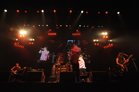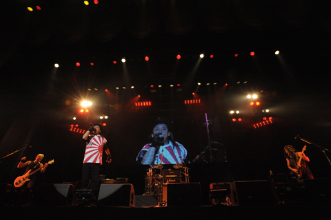 高崎、山下、ドラマー軍団、そして紫のジョージ紫(キーボード)によるジャムの後、いよいよ後半戦に突入。二井原の「ひぐっつぁんが好きだった曲」というコールからディープ・パープルの“Burn”が演奏される。LAZYがアマチュアの頃に大阪のTV番組で披露したことがきっかけで、ムッシュかまやつに見い出されてデビューに至った意義深い1曲だ。そして最後のスペシャル・ゲスト、奥田民生もヴォーカル&ギターで参加。LAZY、LOUDNESSの大ファンであり、LAZYとも同じステージに立った経験のある奥田だけに、バンドとの息もピッタリだ。そして、そのまま奥田が残ってLOUDNESSとのステージへ。“Never Change Your Mind”“Crazy Doctor”と往年の名曲を奥田が二井原と共に普段よりアグレッシヴなヴォーカルでデュエット。