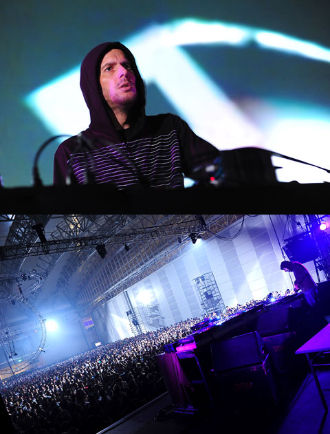 パーカーのフードを目深にかぶった、いかにも英国のパーティー・ピープルっぽいスタイルで登場したクラーク。立ち上がりから強烈なシンセ音がビキビキと唸るエレクトロ調の楽曲で観客の目を一気に覚ましたかと思うと、近年のハードコアなレイヴ路線を踏襲する攻撃的なナンバーを次々と投入して、場の流れを完全に掌握。