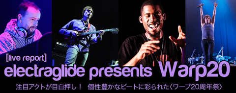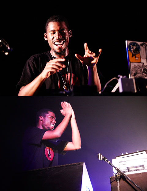いわゆる〈ポスト・J・ディラ〉と呼ばれる世代を代表する存在として、天才ビートメイカーの名をほしいままにしているフライング・ロータス。ストイックで神秘性すら感じさせるその作風からクールで知的な人物像を何となくイメージしてしまっていたが、ステージ上の彼はとことんアグレッシヴ! 大きな身体を上下に激しく動かし、とっておきのおもちゃで遊ぶ子供のように無邪気な笑みを浮かべながら、自作曲を中心に次々とドープなサウンドをフロアに送り込んでいく。ゴジラの鳴き声を挿入してみたり、マイクを握ったかと思うと延々と笑い続けたりと、茶目っ気のあるところも見せつつ、ダブ・ステップやドラムンベースを採り入れたコズミックなビートの奔流で場内を終始圧倒。しかもラストはUGK“Int'l Players Anthem (I Choose You)”からスヌープ・ドッグ“Who Am I(What's My Name)?”へと繋ぐヒップホップ魂に満ちた選曲で、その熱さに思わずガッツポーズしてしまったのは自分だけではないはず! *北野