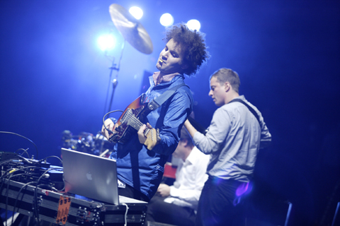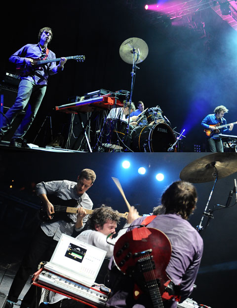 ドラム・キットが舞台のど真ん中にドンと居座り、しかもクラッシュ・シンバルは〈吉川晃司の飛び蹴り用?〉と思わずにはいられないほどの高位置へとセット――異様な雰囲気に満ちたステージ上にまず姿を現したのは、3人いるギタリストのうちのひとり、デイヴ・コノプカ。ベース・パートを弾きながら機材を調整し、ループやエフェクトを駆使して瞬く間に重層的なサウンドを現出させる。そこにふわふわ頭のタイヨンダイ・ブラクストン以下3人のメンバーが登場し、お互いの音を確かめ合うかのように演奏をスタート。