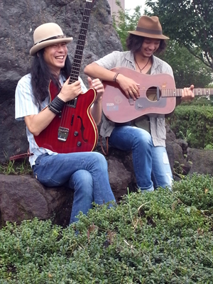 今回の〈NO MUSIC, NO LIFE?〉ポスターは、タワーレコード30周年を記念した〈NO MUSIC, NO LIFE.SONGS〉シリーズにも素敵な曲を提供してくれたCaravan&Curly Giraffeのコンビが登場。清涼感あふれるお二人の撮影レポートをお届けします! ゲリラ台風が襲来していたこの日、早朝から空に穴が空いたような豪雨に見舞われましたが、撮影時は見事に晴れ! 撮影場所は、都内某公園。青々と茂る緑はもちろん、きれいな小川も流れるこの公園を、Caravanさんも「素敵な公園ですね」と気に入ったご様子でした。