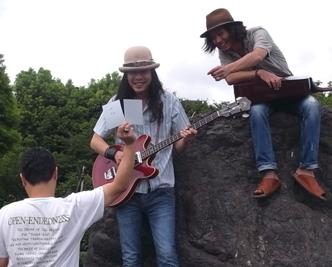 まずは、大きな石に腰掛けて撮影。持参していただいたギターを爪弾きつつ撮影。アコースティック・ギターの柔らかな音色と、お二人が交わす笑顔が素敵すぎます……。