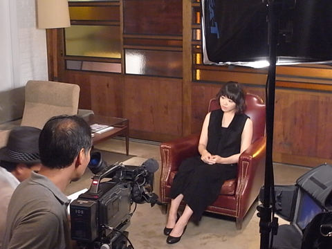 上原さんも成田空港から直接撮影場所へ(お疲れのところありがとうございます!)!! 続いて上原さんインタヴュー中の様子。なんと! タワレコと同い年とのこと(驚)! 「毎年、お誕生日を迎えて年輪を重ねていくのが楽しみなんです」とお話していました。