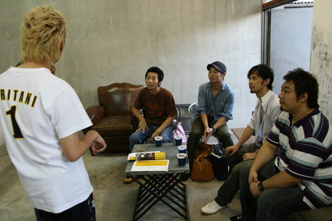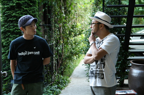 indigo jam unitの皆さんがスタジオ入りし、アート・ディレクターの箭内さんと雑談中。indigo jam unitは前日に名古屋のライヴを終え、楽器を大阪に置いてからふたたび東京へ移動というハード・スケジュール。と言うのも、メンバーの1人がNY在住のため4人が揃うのは年に2回くらいとのこと。その後、須永さんもスタジオ入りし会話に花が咲きます。