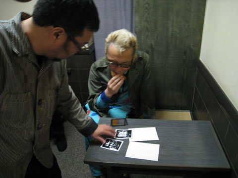 たいやきを食べながら、箭内さんと平間さんで最後にポラチェック。これで〈商売繁盛〉間違いなし!? 悪天候のなか、皆さんお疲れさまでした。
