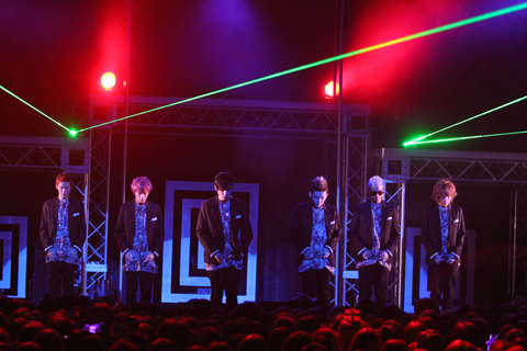 「僕たちもデビューしてから、いつのまにか2年になりましたね。僕たちがみなさんを知ってから2年、みなさんが僕たちを知ってから2年ですよね。ここで、2年前に戻って、デビュー曲の“拍手(Clap)”を聴いていただきます」とスタートした“拍手(Clap)”。イントロでのアクセント・ダンスはもちろん、パフォーマンスも、より堂々と〈魅せる〉ものとなっており、彼らの2年の密度の濃さ、成長の早さを実感する素晴らしいステージでした。続いて、近未来的なヴィジュアルも話題を呼んだ“Supa Luv”では、オーディエンスとの一体感がより強固なものに。