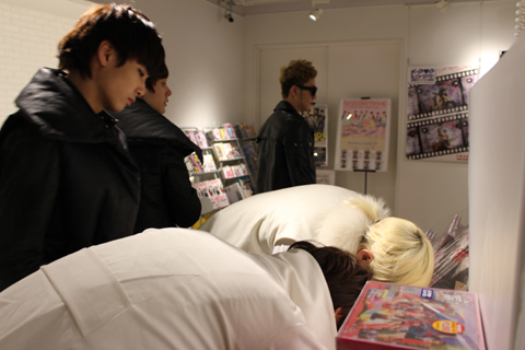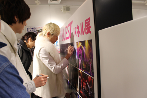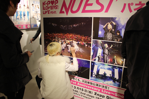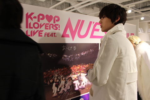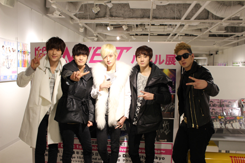1月26日と27日に行われた〈Beat Connection 2013〉へ出演のために来日していた際、忙しい合間を縫ってタワーレコード渋谷店へ訪問した彼ら。〈K-POP LOVERS! SPECIAL SHOP〉に入り、〈K-POP LOVERS! LIVE〉の写真で構成された自分たちのパネルに「おお~!」ととても驚いていました。