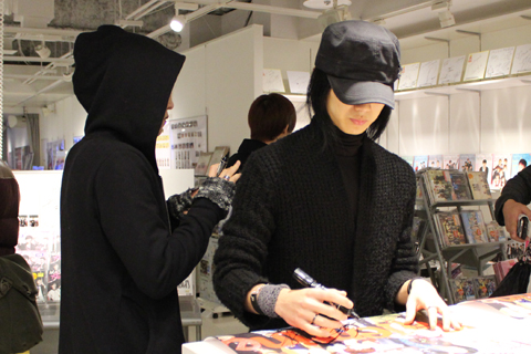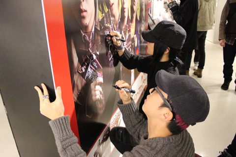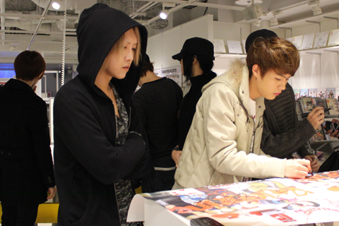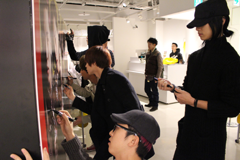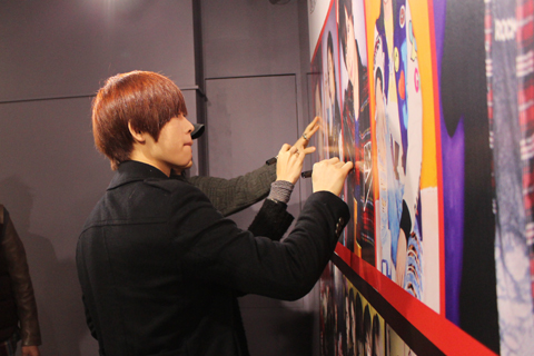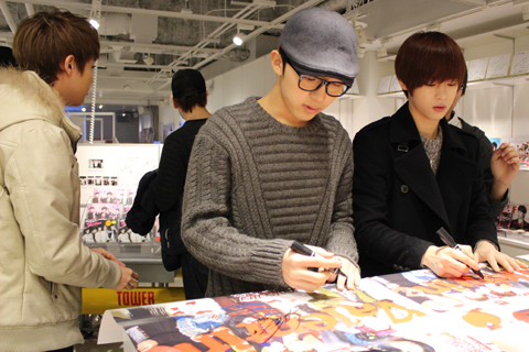 続いては、ポスターにサイン。手の空いたメンバーから、〈K-POP LOVERS! SPECIAL SHOP〉のなかをぶらぶらと見て回ります。
