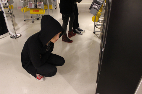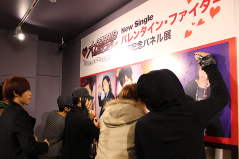 “バレンタイン・ファイター”の入荷日である2月5日の昼ごろ、渋谷店に到着した彼らは、まずは1Fのコーナーをチェック! 続いてエスカレーターで4Fまで上がって、この日からスタートしたパネル展のスペースへと向かいます。