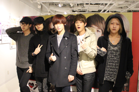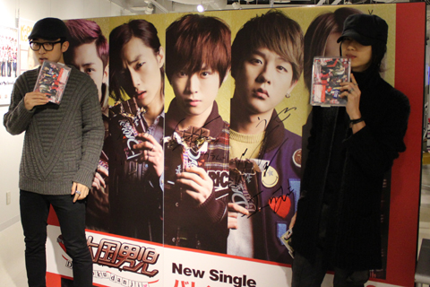 自分たちのCDを手にとってポーズをキメてくれたヒョンミンくん。その後、近くにいたジェイくんを呼んで、二人でパネルの前で記念撮影です。