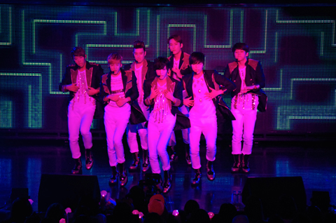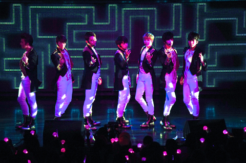 7人が一堂に会しての“NEVERLAND”は、ステージを捉えた映像がそのままバックに映し出されるという、スケールと奥行きを感じる演出。この曲が持つ壮大さ、力強さがさらに増すようなド迫力のパフォーマンスに応える様に、ファンからの声援もより大きなものとなっていた。そして、日本デビュー曲の“Tick Tack”へ。パートによって変化するフォーメーションはもちろん、個々の細やかな動きも美しく、パワーアップしたU-KISSの〈いま〉がしっかりと感じられるステージは圧巻の一言。アルバムに収録されたヴァージョンとは異なるイントロでスタートした“One of You”では、「みんなで歌ってください! 一番大きい声でお願いします!」というコメントとコール&レスポンスの効果も相まって、7人の表情がさらにイキイキとしたものに。会場との一体感がさらに増したところで、続く “Dear My Friend”は、仲のよさそうなメンバー同士のやりとりに黄色い歓声が上がった。