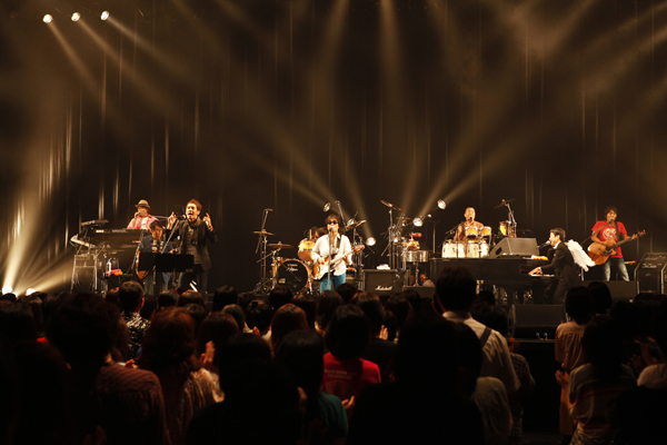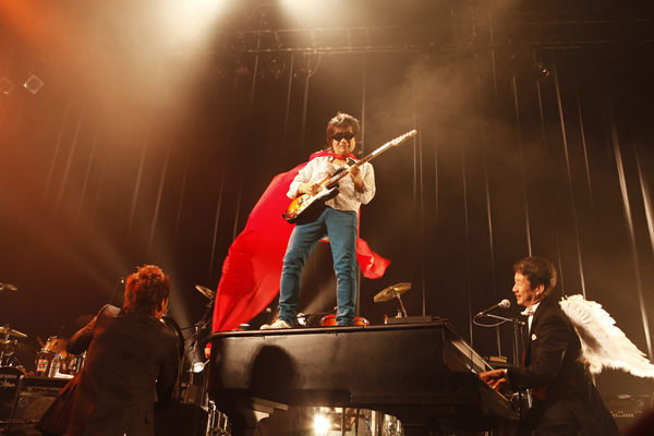 会場に鳴り響く〈キンコンカンコンとチャイム〉の音。そうか、やはり〈学園〉の設定でライヴは進んでいくのか。ならばこちらだってそのノリにしっかりと合わせていかねば、というように元気良く起立する生徒諸君(オーディエンス)。ライヴはのっけから、馬場の“ボーイズ・オン・ザ・ラン”、スタレビの“今夜だけきっと”という強力なナンバーが繰り出されていく。〈SKBオールスターズ〉と名乗ってかねてよりステージ共演を行ってきた3組だけあって、さすがの団結力。こちらの背筋をシャンとさせてくれるほどの素晴らしいハーモニーを轟かせる。今日も背中に羽根を付けたKANの“すべての悲しみにさよならするために”のときには、グランドピアノの上に立ち、真っ赤なマントをなびかせながらグイグイとギター・ソロをかましてみせた根本要。そして下には、ジェットファン(業務用扇風機)を使って先輩に風を送り、直後マイクを拾ってコーラスする馬場の姿が。その美しき後輩愛が多くの観客の胸を熱くしたことは言うまでもない。