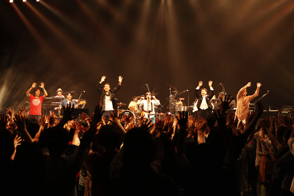 予想外の叫びにオーディエンスは大盛り上がりに。エンディングを締め括る根本と馬場によるアコギのピッキング・ハーモニクスもバッチリいって大拍手だった。