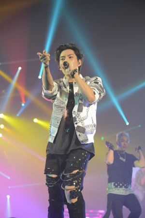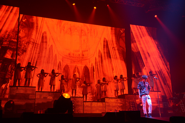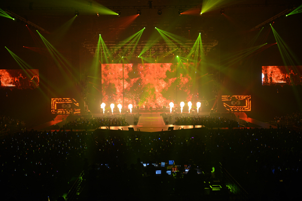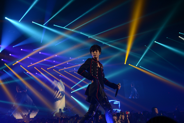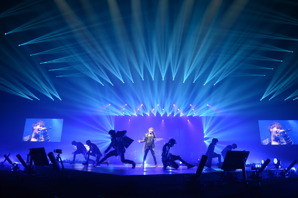 公演のなかに挟み込まれた映像のテーマは、〈音楽のなくなった世界で、INFINITEが音楽で世界を救う〉というもの。〈MUSIC IS DEAD〉〈KEEP SILENT〉という文字が掲げられ、歌うことすら禁じられた世界を生きるINFINITEの7人が、音楽を取り戻すために戦っていく――。その序章とも言えるオープニング・ムービーが終了したあと、檻に囚われたINFINITEが舞台後方から登場し、手錠を外してステージへと移動、韓国最新曲の“Destiny”がスタートしたときにまず目を惹いたのは、彼らを彩る照明の多さと鮮やかさ。INFINITEの音楽とパフォーマンスに呼応するかのように動くライトの躍動感と色彩豊かな演出は、今回のライヴの見どころの1つといえるだろう。