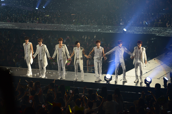 ライヴの最後に披露された“With”では、歌を真剣に届けようとする7人はもちろん、その気持ちに応えるように「サランヘ!」とコールするファンの声が響きわたる。そして、楽曲の終盤で一気に会場の照明が落とされ、数秒後に光が広がると、ステージをキラキラと舞う紙吹雪が……。アンコールを終えた後、メンバーたちはセンター・ステージや花道を歩きながら礼をしながら移動。7人の満足そうな表情と、最後までステージに残っていたウヒョンがずっとずっと観客に手を振り続けていた姿が、とても印象的だった。