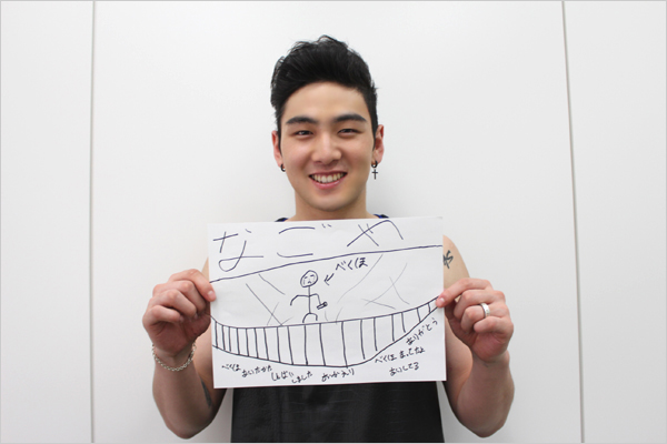 ベクホ「(メンバーがクスクス笑い始める)まず……、僕は絵が下手ですから、先に謝りますね。ごめんなさい! 僕は、今回のツアーの初日だった名古屋のライヴの絵です。ファンのみなさんが〈ベクホ、待ってたよ〉っていうカードを客席から見せてくれたんです。それを見て、僕は感動してステージで泣いてしまって。“Shalala Ring”のプロモーションのあと、僕は喉の治療のために活動をお休みしていたんですが、ファンのみなさんが僕のことを待っていてくれたことが本当に嬉しくて、大切な思い出になりました」