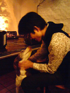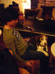 サウンドチェック中、ライヴハウスのオーナーと思しき男性が愛犬を連れて登場。