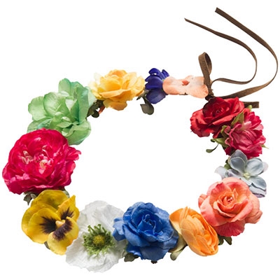 サイズがリボンで調整できるビビットな色合いのリース。フェスでは髪に、おうちでは壁やドアにも飾れます。